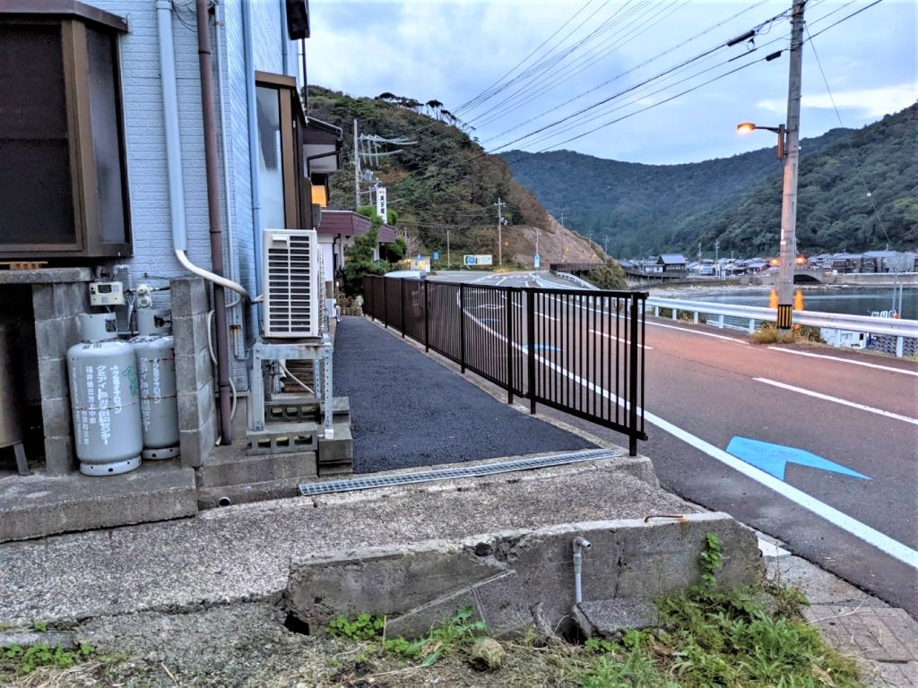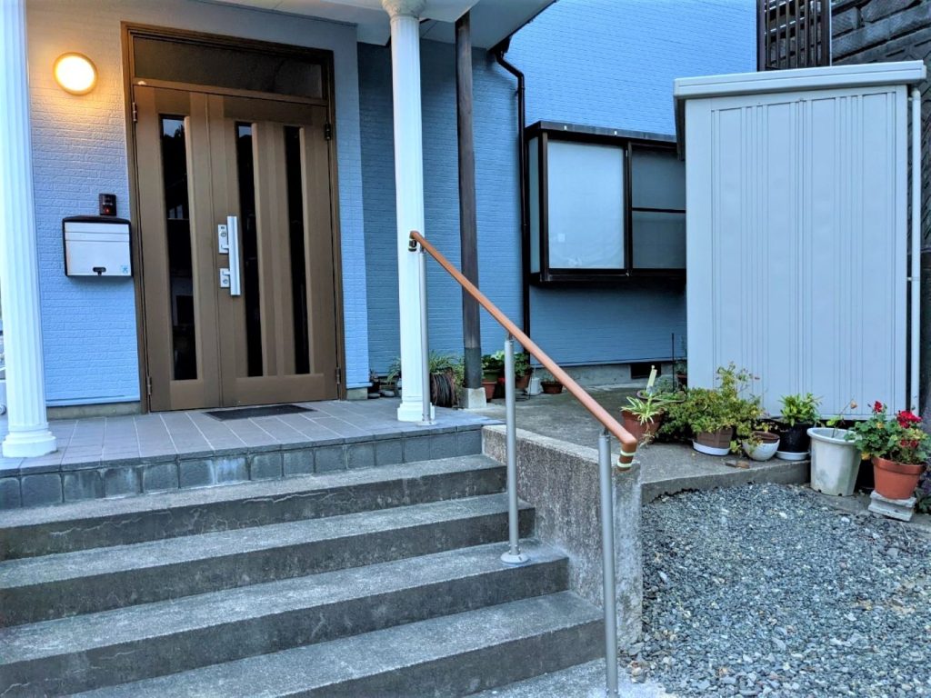玄関にはかねてより欲しかった階段手摺と、草取りから開放されたい雑草対策にアスファルト工事、道路との境界にフェンス設置を合わせて行い 完成しました
