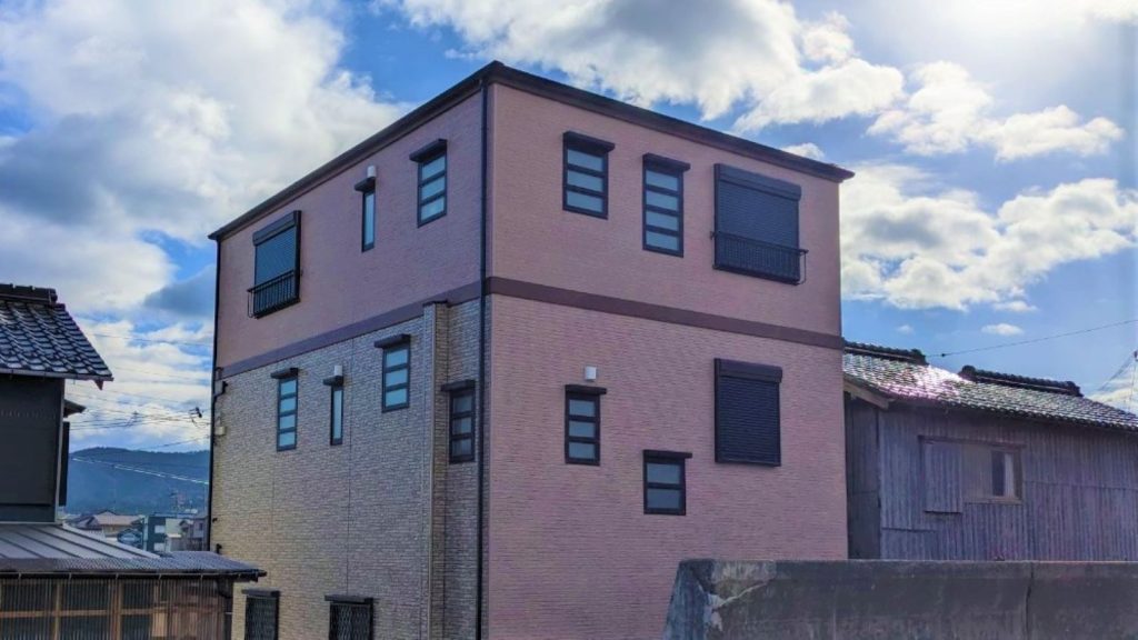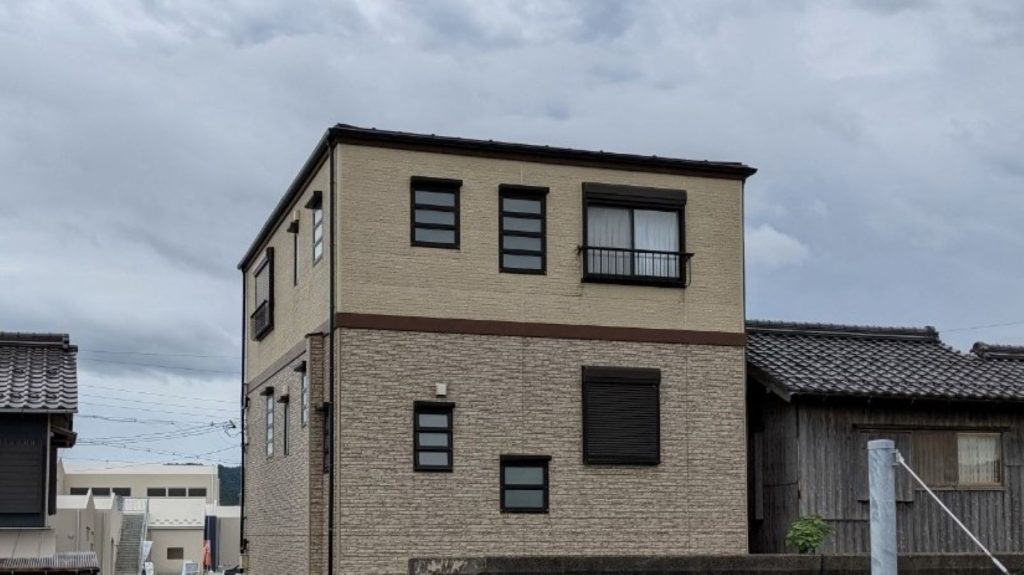 外壁の3階は アステックペイント製「シリコンREVO1000-IR」艶有り 色:モカ