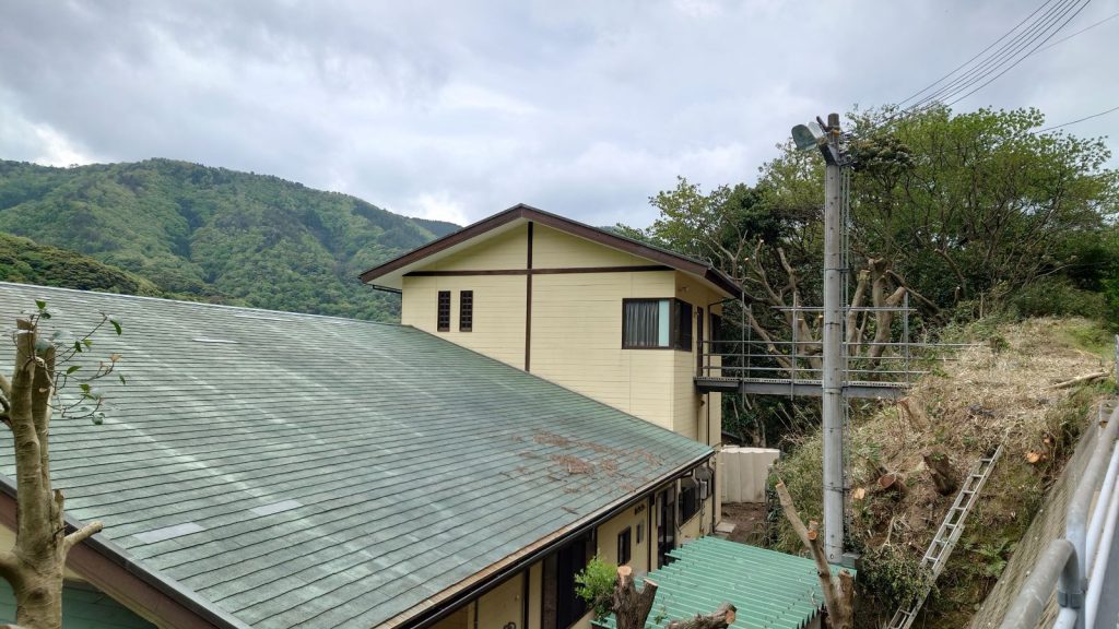 まず、外壁のツタを手作業で除去後、屋根から順番に高圧で洗浄し、コケや汚れを丁寧に洗い流します